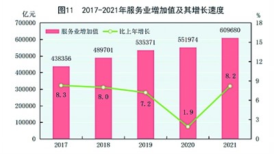 全年批發(fā)和零售業(yè)增加值110493億元,比上年增長11.3%;交通運輸、倉儲和郵政業(yè)增加值47061億元,增長12.1%;住宿和餐飲業(yè)增加值17853億元,增長14.5%;金融業(yè)增加值91206億元,增長4.8%;房地產(chǎn)業(yè)增加值77561億元,增長5.2%;信息傳輸、軟件和信息技術(shù)服務(wù)業(yè)增加值43956億元,增長17.2%;租賃和商務(wù)服務(wù)業(yè)增加值35350億元,增長6.2%。全年規(guī)模以上服務(wù)業(yè)企業(yè)營業(yè)收入比上年增長18.7%,利潤總額增長13.4%。(見圖11)
