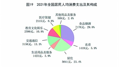 全年全國居民人均消費支出24100元,比上年增長13.6%,扣除價格因素,實際增長12.6%。其中,人均服務(wù)性消費支出[56]10645元,比上年增長17.8%,占居民人均消費支出的比重為44.2%。按常住地分,城鎮(zhèn)居民人均消費支出30307元,增長12.2%,扣除價格因素,實際增長11.1%;農(nóng)村居民人均消費支出15916元,增長16.1%,扣除價格因素,實際增長15.3%。全國居民恩格爾系數(shù)為29.8%,其中城鎮(zhèn)為28.6%,農(nóng)村為32.7%。(見圖18)(見圖19)
