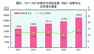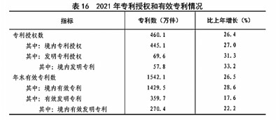 全年研究與試驗發(fā)展(R&D)經(jīng)費支出27864億元,比上年增長14.2%,與國內(nèi)生產(chǎn)總值之比為2.44%,其中基礎(chǔ)研究經(jīng)費1696億元。國家自然科學(xué)基金共資助4.87萬個項目。截至年末,正在運行的國家重點實驗室533個,納入新序列管理的國家工程研究中心191個,國家企業(yè)技術(shù)中心1636家,大眾創(chuàng)業(yè)萬眾創(chuàng)新示范基地212家。國家科技成果轉(zhuǎn)化引導(dǎo)基金累計設(shè)立36支子基金,資金總規(guī)模624億元。國家級科技企業(yè)孵化器[60]1287家,國家備案眾創(chuàng)空間[61]2551家。全年授予專利權(quán)460.1萬件,比上年增長26.4%;PCT專利申請受理量[62]7.3萬件。截至年末,有效專利1542.1萬件,其中境內(nèi)有效發(fā)明專利270.4萬件。每萬人口高價值發(fā)明專利擁有量[63]7.5件。全年商標(biāo)注冊773.9萬件,比上年增長34.3%。全年共簽訂技術(shù)合同67萬項,技術(shù)合同成交金額37294億元,比上年增長32.0%。(見圖20)(見表16)