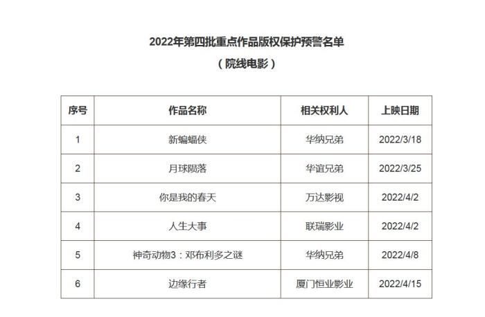 2022第四批重點(diǎn)作品版權(quán)保護(hù)預(yù)警名單(院線(xiàn)電影)公布