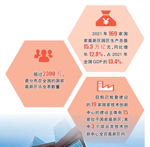 來自科技部火炬中心的數(shù)據(jù)顯示:2021年169家國(guó)家高新區(qū)園區(qū)生產(chǎn)總值15.3萬億元,同比增長(zhǎng)12.8%,占2021年全國(guó)GDP的13.4%。