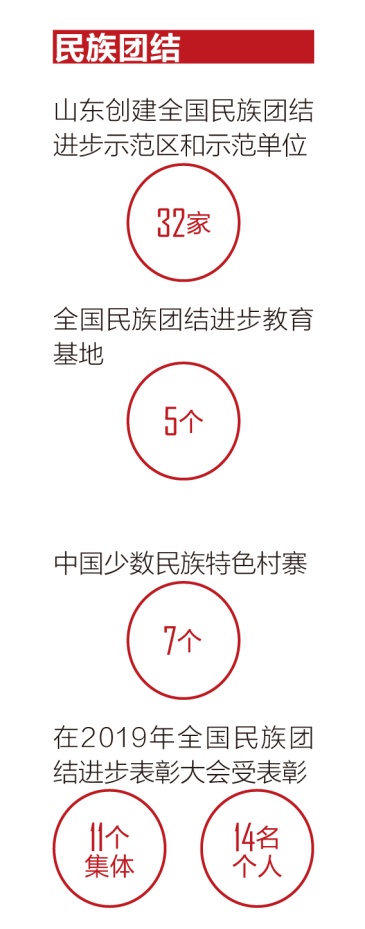 在全國率先啟動民族團(tuán)結(jié)進(jìn)步和美家庭、示范崗位評選工作,營造爭先創(chuàng)優(yōu)氛圍。連續(xù)21年開展民族團(tuán)結(jié)進(jìn)步宣傳月活動,成為民族團(tuán)結(jié)進(jìn)步宣傳教育的特色品牌。實(shí)施城市民族工作“十有”示范社區(qū)建設(shè),開展城市民族工作“紅石榴”品牌創(chuàng)建活動,青島市、煙臺市、濟(jì)南市歷下區(qū)先后被國家民委確定為全國少數(shù)民族流動人口服務(wù)管理示范城市。截至目前,山東創(chuàng)建全國民族團(tuán)結(jié)進(jìn)步示范區(qū)和示范單位32家、全國民族團(tuán)結(jié)進(jìn)步教育基地5個、中國少數(shù)民族特色村寨7個,在2019年全國民族團(tuán)結(jié)進(jìn)步表彰大會上有11個集體和14名個人受到表彰。