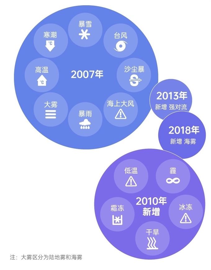 2007年,中國氣象局制定并發(fā)布《中央氣象臺氣象災(zāi)害警報發(fā)布辦法(試行)》,適用于8類氣象災(zāi)害預(yù)警;2010年,氣象災(zāi)害預(yù)警增至13類;2013年新增強(qiáng)對流預(yù)警發(fā)布辦法,至此氣象災(zāi)害預(yù)警增至14類。2018年,在大霧氣象災(zāi)害預(yù)警中還新增了海霧預(yù)警發(fā)布辦法。