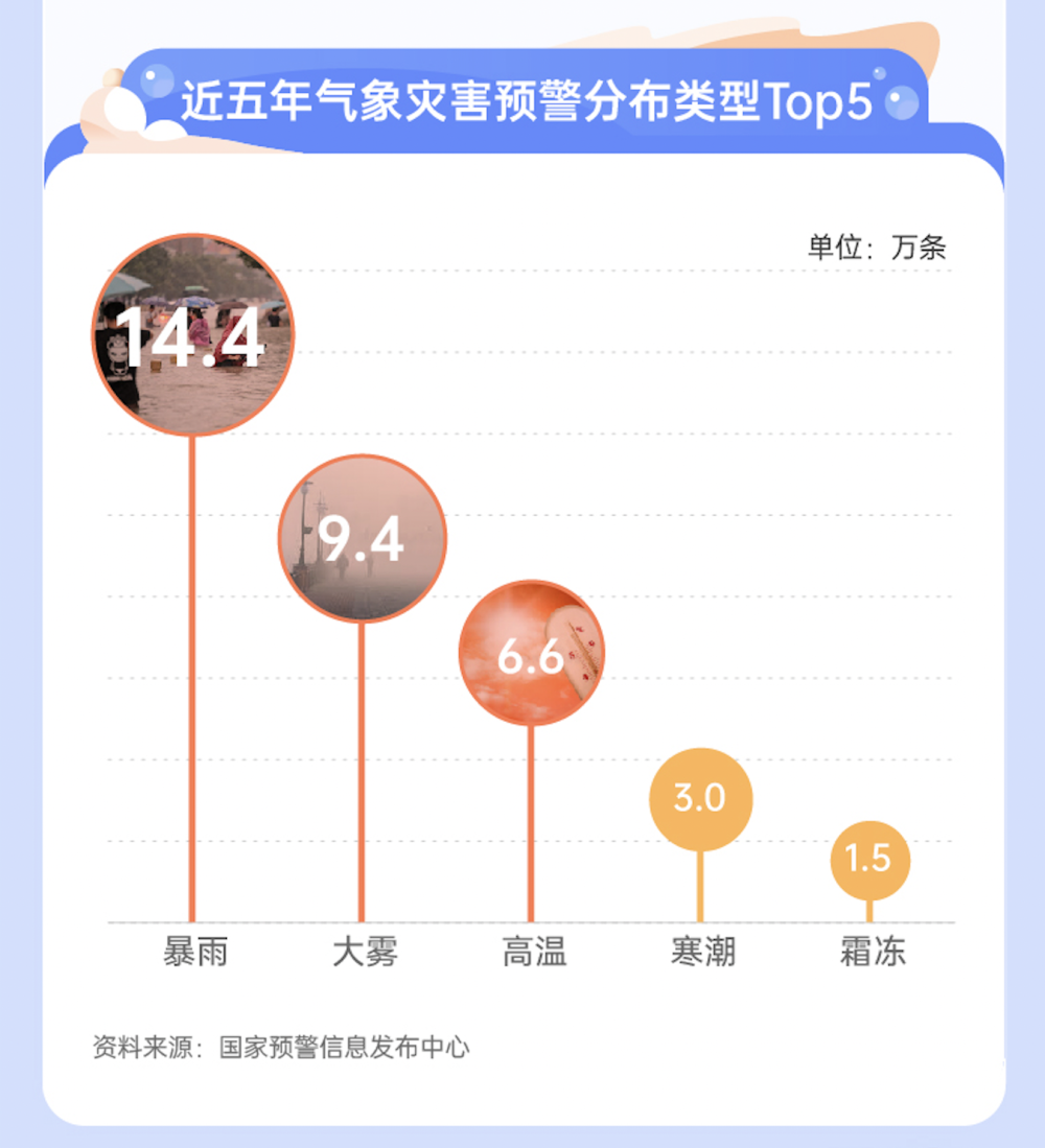 近5年,國家預(yù)警信息發(fā)布中心平均每年發(fā)布19.5萬條氣象預(yù)警信息,暴雨、大霧、高溫是發(fā)布最多的氣象災(zāi)害預(yù)警。