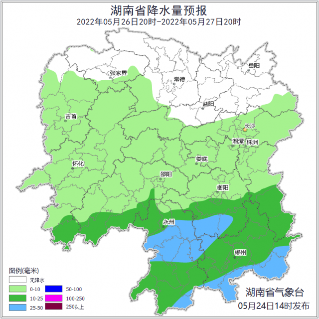 近期湖南雨水不休,湘中、湘南降雨偏多,陰雨日數(shù)多,累積雨量大。其中24日,湘南局地暴雨,25日至27日降雨范圍擴(kuò)大,強(qiáng)度減弱,全省大部有小到中雨,湘南和湘中局地大雨。氣溫呈穩(wěn)步回升態(tài)勢。