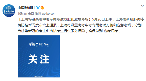5月26日上午,上海市新冠肺炎疫情防控新聞發(fā)布會(huì)上通報(bào),上海將設(shè)置高考中考專(zhuān)用考試方艙和應(yīng)急考場(chǎng),分別為感染新冠的考生和密接考生提供服務(wù)保障,確保做到“應(yīng)考盡考”。