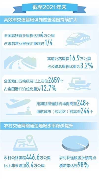 高效率交通基礎(chǔ)設(shè)施覆蓋范圍持續(xù)擴(kuò)大。截至2021年末,全國高鐵營業(yè)里程達(dá)到4萬公里,占鐵路營業(yè)里程比重超過1/4。高速公路里程16.9萬公里,比上年末增加8090公里,占公路總里程比重為3.2%,呈現(xiàn)穩(wěn)步提高態(tài)勢。全國港口萬噸級及以上泊位2659個(gè)、增加67個(gè),占全國港口泊位比重為12.7%、提高1個(gè)百分點(diǎn)。定期航班通航機(jī)場、通航城市(或地區(qū))分別提高至248個(gè)和244個(gè)。