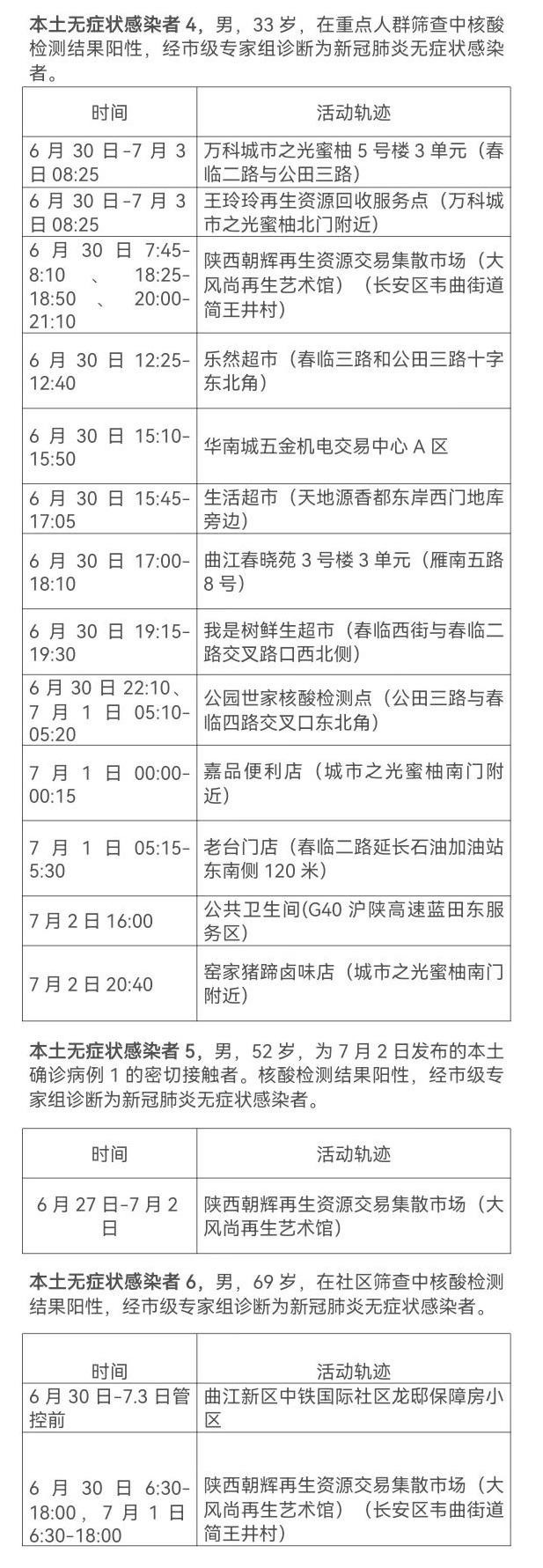 7月3日0-24時(shí),西安新增3例本土無(wú)癥狀感染者,2例在重點(diǎn)人群核酸檢測(cè)中發(fā)現(xiàn),1例在社區(qū)篩查中發(fā)現(xiàn)。主要活動(dòng)軌跡如下: