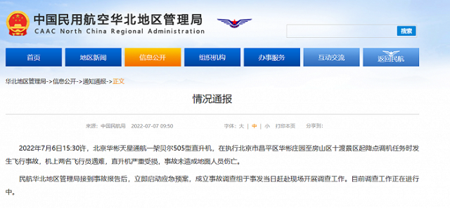 據(jù)民航局華北地區(qū)管理局網(wǎng)站7月7日消息,2022年7月6日15:30許,北京華彬天星通航一架貝爾505型直升機(jī),在執(zhí)行北京市昌平區(qū)華彬莊園至房山區(qū)十渡景區(qū)起降點調(diào)機(jī)任務(wù)時發(fā)生飛行事故,機(jī)上兩名飛行員遇難,直升機(jī)嚴(yán)重受損,事故未造成地面人員傷亡。