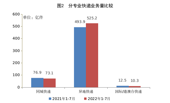 1-7月,全國(guó)快遞服務(wù)企業(yè)業(yè)務(wù)量累計(jì)完成608.6億件,同比增長(zhǎng)4.3%;業(yè)務(wù)收入累計(jì)完成5880.4億元,同比增長(zhǎng)3.7%。其中,同城業(yè)務(wù)量累計(jì)完成73.1億件,同比下降4.9%;異地業(yè)務(wù)量累計(jì)完成525.2億件,同比增長(zhǎng)6.3%;國(guó)際/港澳臺(tái)業(yè)務(wù)量累計(jì)完成10.3億件,同比下降17.8%。
