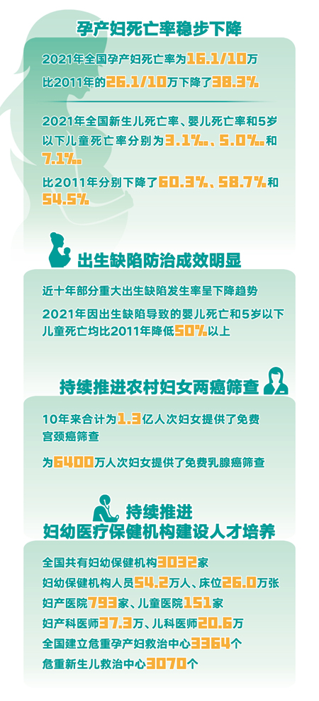 除了“兩癌”篩查,過去10年,我國婦幼健康保障水平整體取得了較大進展。截至今年5月,全國共有婦幼保健機構3032家,婦幼保健機構專業(yè)人員54.2萬人,床位數(shù)26萬張。全國共有婦產醫(yī)院793家,兒童醫(yī)院151家,婦產科醫(yī)師37.3萬人,我國婦幼健康服務能力得到持續(xù)提升。