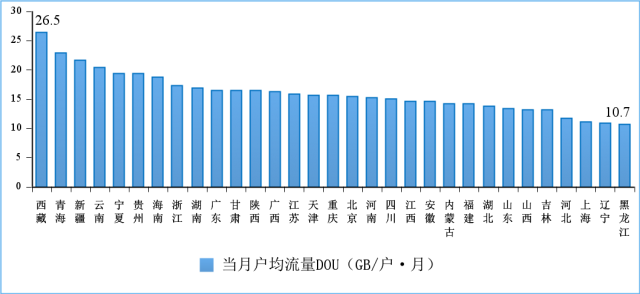 中部地區(qū)移動互聯(lián)網(wǎng)接入流量增速領(lǐng)先,西部部分省份DOU值居全國前列。1—7月份,東、中、西部和東北地區(qū)移動互聯(lián)網(wǎng)接入流量分別達到622.1億GB、330.6億GB、434.6億GB和75.5億GB,同比增長19.1%、20.5%、19.4%和12.5%。西藏、青海、新疆和云南4省7月當(dāng)月戶均移動互聯(lián)網(wǎng)接入流量(DOU)超過20GB/戶·月;各省DOU值最高值與最低值之差為15.8GB/戶·月,差值較去年同期擴大2.4GB/戶·月。