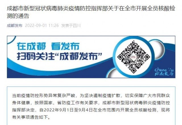 央視網(wǎng)消息:9月1日,成都市新型冠狀病毒肺炎疫情防控指揮部發(fā)布《關(guān)于在全市開展全員核酸檢測的通告》。