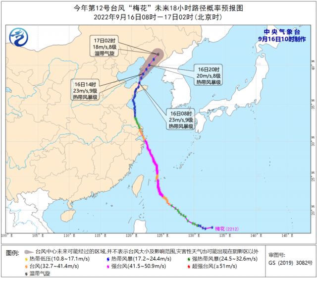 臺(tái)風(fēng)“梅花”未來(lái)24小時(shí)路徑概率預(yù)報(bào)圖(2022年9月16日8時(shí)至17日2時(shí)) 來(lái)源:中央氣象臺(tái)