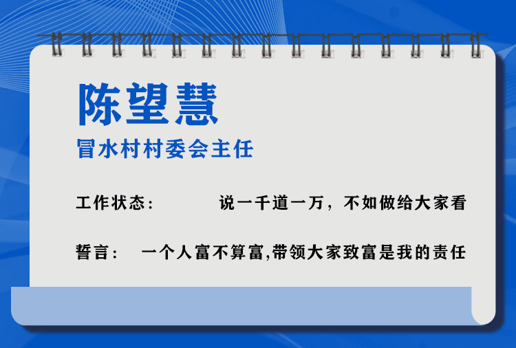 2011年,陳望慧加入了中國共產(chǎn)黨。這一年,冒水村換屆選舉,陳望慧作為村上的致富能人,在村黨支部多次動(dòng)員和群眾的勸說下,放下經(jīng)營多年、收入可觀的飯店回村,當(dāng)選為冒水村村委會(huì)主任。