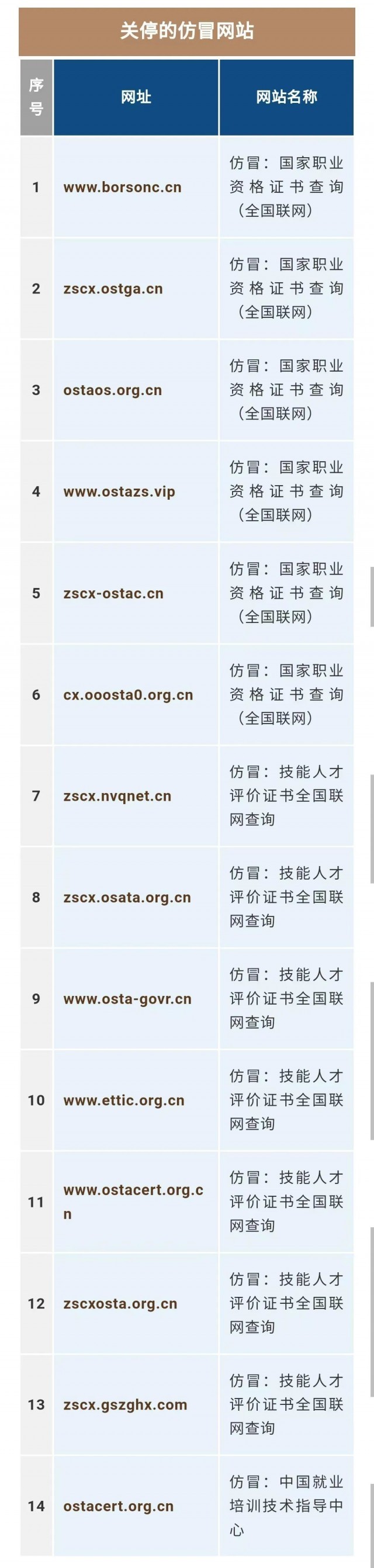 根據(jù)網(wǎng)絡(luò)巡查和群眾舉報(bào)情況,人力資源社會(huì)保障部聯(lián)合有關(guān)部門查實(shí)并關(guān)停了14個(gè)仿冒網(wǎng)站,其網(wǎng)站名稱、網(wǎng)址及頁面內(nèi)容與人力資源社會(huì)保障部技能類“職業(yè)資格證書”“職業(yè)技能等級(jí)證書”(以下簡(jiǎn)稱技能類評(píng)價(jià)證書)查詢官方網(wǎng)站高度相似,容易誤導(dǎo)社會(huì)公眾。目前,上述14個(gè)網(wǎng)站均已被關(guān)停。