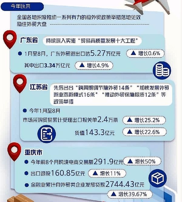 跨境電商等新業(yè)態(tài)也成為穩(wěn)外貿的重要力量。今年,重慶成功舉辦了跨境電商交易會,積極推動跨境電商“保稅進口+零售分裝”業(yè)務試點,推廣“跨境電商+產業(yè)帶”模式,為外貿企業(yè)穩(wěn)訂單、拓市場提供了新的解決方案。今年前8個月,重慶跨境電商交易額達291.9億元,增長50%。