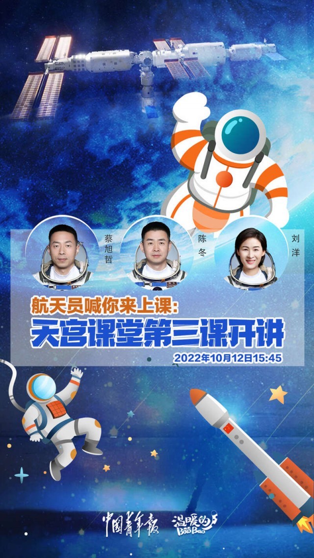 中國青年報客戶端北京10月12日電(中青報·中青網(wǎng)記者 邱晨輝)據(jù)中國載人航天工程辦公室消息,北京時間2022年10月12日16時01分,“天宮課堂”第三課在中國空間站開講,新晉“太空教師”陳冬、劉洋、蔡旭哲為廣大青少年帶來一場精彩的太空科普課,這是中國航天員首次在問天實驗艙內(nèi)進(jìn)行授課。