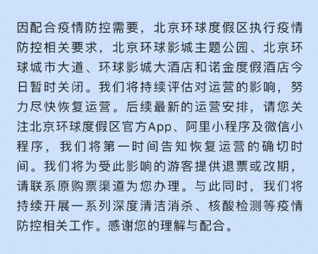 據(jù)@北京環(huán)球度假區(qū) 微博消息,因配合疫情防控需要,北京環(huán)球度假區(qū)執(zhí)行疫情防控相關(guān)要求,北京環(huán)球影城主題公園、北京環(huán)球城市大道、環(huán)球影城大酒店和諾金度假酒店今日暫時(shí)關(guān)閉。我們將持續(xù)評(píng)估對(duì)運(yùn)營(yíng)的影響,努力盡快恢復(fù)運(yùn)營(yíng)。后續(xù)最新的運(yùn)營(yíng)安排,請(qǐng)您關(guān)注北京環(huán)球度假區(qū)官方App、阿里小程序及微信小程序,我們將第一時(shí)間告知恢復(fù)運(yùn)營(yíng)的確切時(shí)間。我們將為受此影響的游客提供退票或改期,請(qǐng)聯(lián)系原購(gòu)票渠道為您辦理。與此同時(shí),我們將持續(xù)開(kāi)展一系列深度清潔消殺、核酸檢測(cè)等疫情防控相關(guān)工作。感謝您的理解與配合。