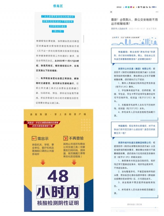 最早宣布取消的是貴陽市。11月3日,“貴陽市人民政府網(wǎng)”發(fā)布《最新!@貴陽人,乘公交坐地鐵不用出示核酸結(jié)果!》,宣布根據(jù)貴陽市《常態(tài)化核酸檢測實施方案》以及疫情防控的相關(guān)要求,乘客乘坐公交車和地鐵時均不需要查驗核酸檢測結(jié)果。