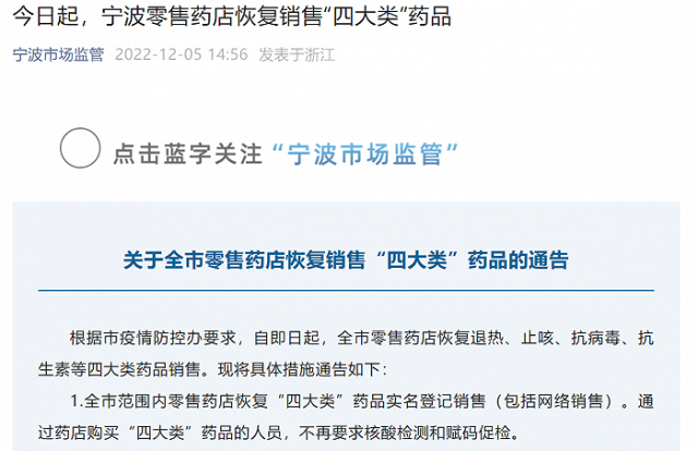 寧波市市場監(jiān)督管理局12月5日在其官方微信公眾號(hào)上發(fā)布通告,根據(jù)市疫情防控辦要求,自即日起,全市零售藥店恢復(fù)退熱、止咳、抗病毒、抗生素等四大類藥品銷售?,F(xiàn)將具體措施通告如下: