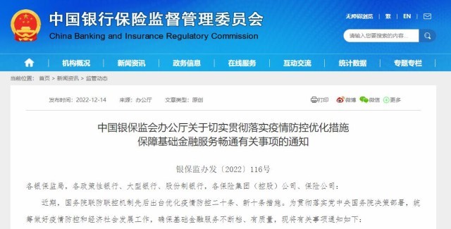 央視網消息:12月13日,中國銀保監(jiān)會辦公廳發(fā)文《關于切實貫徹落實疫情防控優(yōu)化措施 保障基礎金融服務暢通有關事項的通知》。