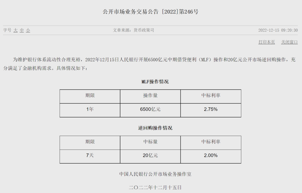 為維護(hù)銀行體系流動(dòng)性合理充裕,12月15日中國(guó)人民銀行開展6500億元中期借貸便利(MLF)操作和20億元公開市場(chǎng)逆回購(gòu)操作,充分滿足了金融機(jī)構(gòu)需求,中標(biāo)利率均與前次持平。