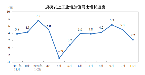 國(guó)家統(tǒng)計(jì)局:2022年11月份規(guī)模以上工業(yè)增加值增長(zhǎng)2.2%
