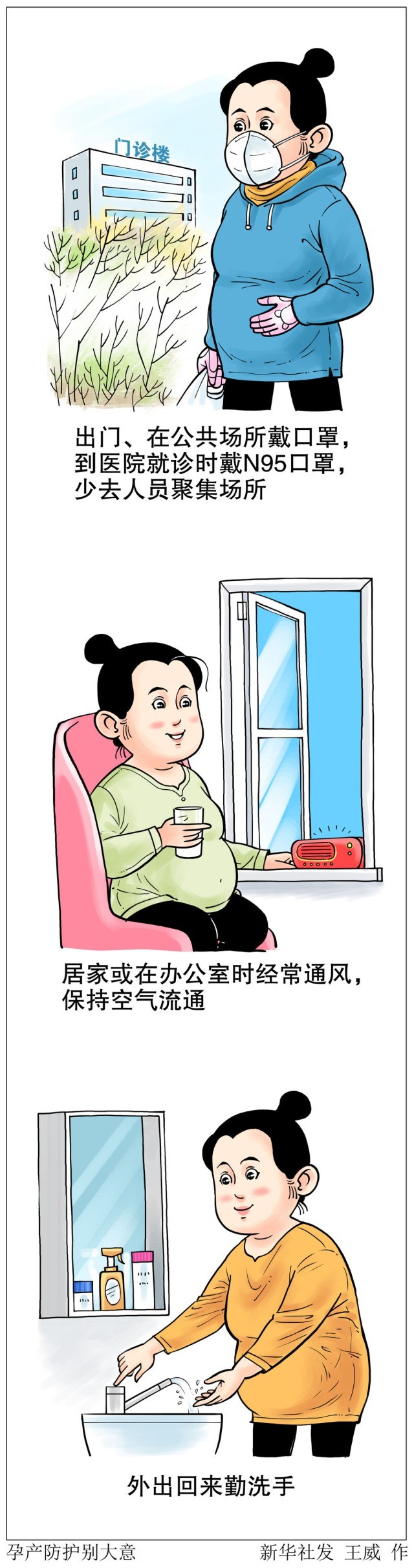 孕產(chǎn)婦需注意防護,做到以下關(guān)鍵點:出門、在公共場所戴口罩,到醫(yī)院就診時戴N95口罩,少去人員聚集場所;居家或在辦公室時經(jīng)常通風(fēng),保持空氣流通;外出回來勤洗手。
