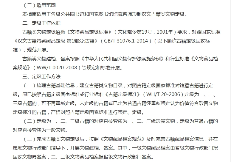 定級為一、二、三級古籍的對應(yīng)直接套轉(zhuǎn)為一、二、三級珍貴文物,定級為普通古籍的對應(yīng)直接套轉(zhuǎn)為一般文物。