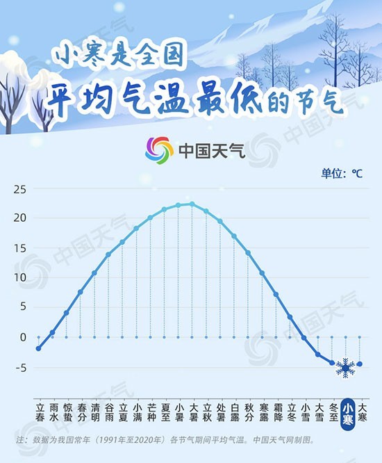 據(jù)中國(guó)天氣網(wǎng)氣象分析師王偉躍介紹,小寒節(jié)氣冷空氣活動(dòng)頻繁,氣溫下降明顯,北方天寒地凍,滴水成冰,南方霜雪交加,冷透肌骨。氣象數(shù)據(jù)顯示,小寒是二十四節(jié)氣中全國(guó)平均氣溫最低的節(jié)氣,僅-5.1℃;其次是大寒節(jié)氣,達(dá)-4.5℃。