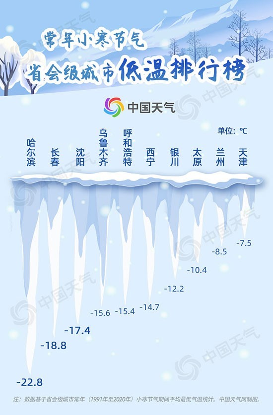 從中國(guó)天氣網(wǎng)1991-2020年小寒節(jié)氣省會(huì)級(jí)城市低溫排行榜可以看出,上榜的均為北方城市,其中哈爾濱以-22.8℃位列榜首,長(zhǎng)春和沈陽(yáng)分別位居第二、第三。