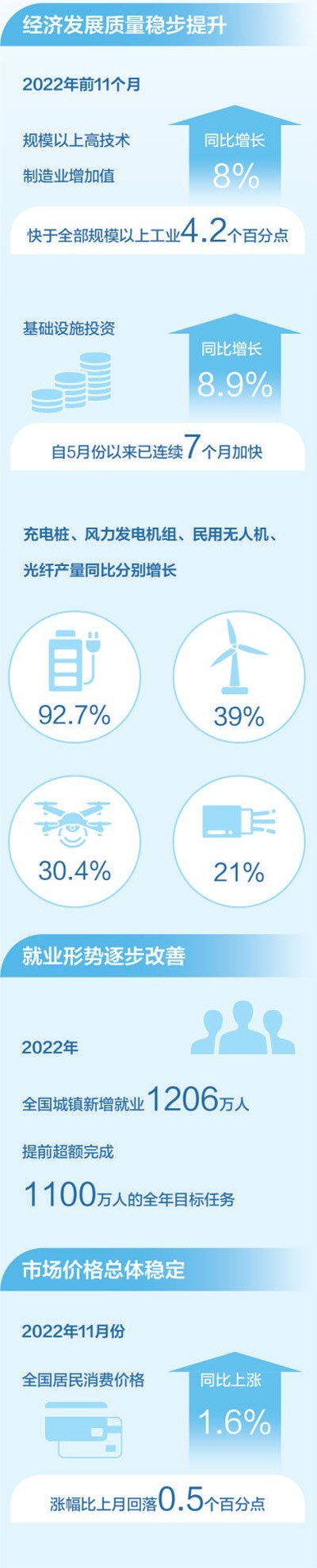 2022年,面對(duì)風(fēng)高浪急的國(guó)際環(huán)境和艱巨繁重的國(guó)內(nèi)改革發(fā)展穩(wěn)定任務(wù),我國(guó)經(jīng)濟(jì)穩(wěn)健發(fā)展,全年國(guó)內(nèi)生產(chǎn)總值預(yù)計(jì)超過120萬(wàn)億元??垂┙o結(jié)構(gòu),產(chǎn)業(yè)升級(jí)發(fā)展持續(xù),新動(dòng)能積蓄增強(qiáng)。2022年前11個(gè)月,規(guī)模以上高技術(shù)制造業(yè)增加值同比增長(zhǎng)8%,快于全部規(guī)模以上工業(yè)4.2個(gè)百分點(diǎn);看消費(fèi)需求,線上消費(fèi)需求釋放帶動(dòng)作用明顯。前11個(gè)月,全國(guó)實(shí)物商品網(wǎng)上零售額同比增長(zhǎng)6.4%,網(wǎng)絡(luò)購(gòu)物帶動(dòng)快遞等行業(yè)較快增長(zhǎng)。