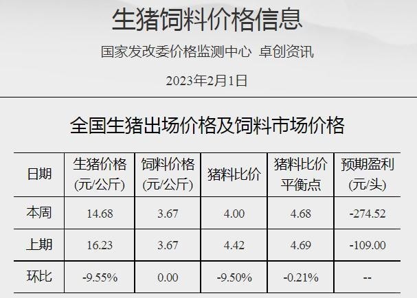 中新網(wǎng)2月6日電 據(jù)國(guó)家發(fā)改委價(jià)格監(jiān)測(cè)中心網(wǎng)站消息,截至2023年2月1日當(dāng)周,全國(guó)豬料比價(jià)為4.00,較春節(jié)前(1月18日)下降9.50%。按目前價(jià)格及成本推算,未來(lái)生豬養(yǎng)殖頭均虧損為274.52元。當(dāng)周國(guó)內(nèi)豬價(jià)以降為主。隨著春節(jié)假期收尾,終端消費(fèi)漸顯疲軟,屠宰企業(yè)開(kāi)工率低位調(diào)整,整體收購(gòu)難度不大,壓價(jià)情緒較濃,而養(yǎng)殖端雖有抗價(jià)情緒,但生豬出欄壓力仍存,周內(nèi)豬價(jià)小幅走低。