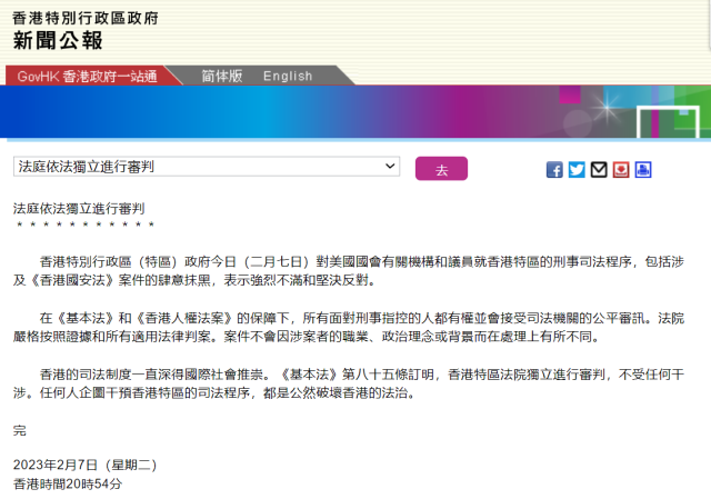 香港特區(qū)政府:堅(jiān)決反對(duì)美國(guó)會(huì)有關(guān)機(jī)構(gòu)及議員抹黑香港刑事司法程序