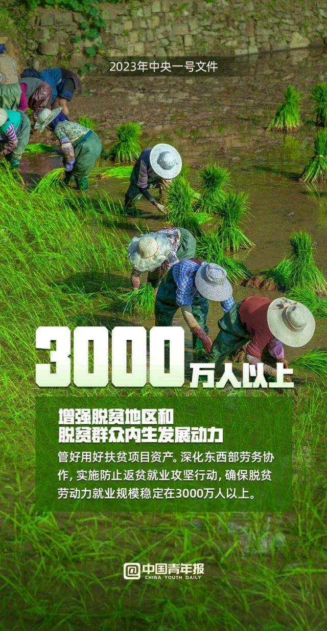 中國(guó)青年報(bào)客戶端訊(中青報(bào)·中青網(wǎng)見(jiàn)習(xí)記者 魏婉 制圖 程璨)“確保全國(guó)糧食產(chǎn)量保持在1.3萬(wàn)億斤以上、確保脫貧勞動(dòng)力就業(yè)規(guī)模穩(wěn)定在3000萬(wàn)人以上……”2月13日,2023年中央一號(hào)文件正式發(fā)布,這份文件題為《中共中央 國(guó)務(wù)院關(guān)于做好2023年全面推進(jìn)鄉(xiāng)村振興重點(diǎn)工作的意見(jiàn)》,全文共九個(gè)部分。文件提出,堅(jiān)決守牢確保糧食安全、防止規(guī)模性返貧等底線,扎實(shí)推進(jìn)鄉(xiāng)村發(fā)展、鄉(xiāng)村建設(shè)、鄉(xiāng)村治理等重點(diǎn)工作,加快建設(shè)農(nóng)業(yè)強(qiáng)國(guó),建設(shè)宜居宜業(yè)和美鄉(xiāng)村。