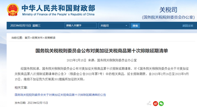 經(jīng)國(guó)務(wù)院批準(zhǔn),國(guó)務(wù)院關(guān)稅稅則委員會(huì)公布對(duì)美加征關(guān)稅商品第十次排除延期清單,對(duì)《國(guó)務(wù)院關(guān)稅稅則委員會(huì)關(guān)于對(duì)美加征關(guān)稅商品第八次排除延期清單的公告》(稅委會(huì)公告2022年第7號(hào))中的相關(guān)商品,延長(zhǎng)排除期限,自2023年2月16日至2023年9月15日,繼續(xù)不加征我為反制美301措施所加征的關(guān)稅。