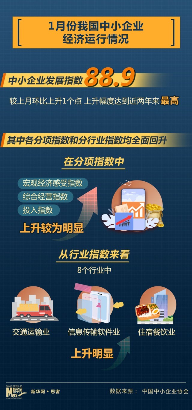 近日中國中小企業(yè)協(xié)會公布我國中小企業(yè)經(jīng)濟運行情況。2023年1月份,中國中小企業(yè)發(fā)展指數(shù)為88.9,比去年12月回升1個點,上升幅度達(dá)到近兩年來最高。其中,企業(yè)發(fā)展信心回升,反映企業(yè)信心狀況的宏觀經(jīng)濟感受指數(shù)為98.7,比上月上升2.1點。市場預(yù)期有所提振,市場指數(shù)為80.7,環(huán)比上升0.9點。
