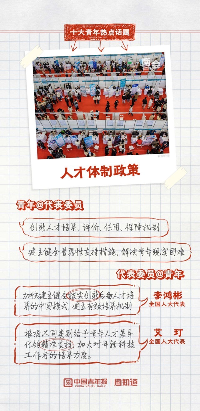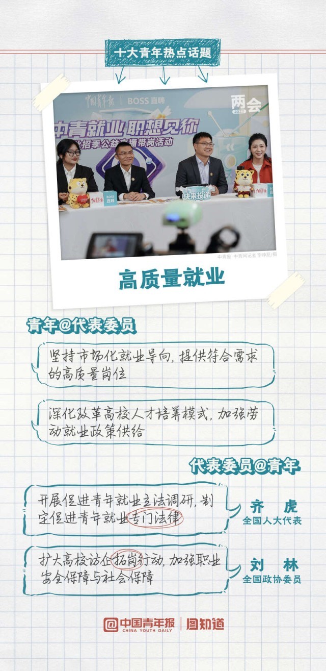 如何實現(xiàn)高質(zhì)量就業(yè)、如何破解“不敢生”、如何遏制網(wǎng)絡暴力……兩會前,團中央權益部、中國青年報社等機構聯(lián)合梳理了青年關心的十大熱點話題。這些話題也被代表委員關注,他們提出很多真知灼見。青年關心,代表委員關注,一起來看看代表委員怎么說。