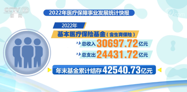 2022年,基本醫(yī)療保險基金(含生育保險)總收入、總支出分別為30697.72億元、24431.72億元,年末基金累計結存42540.73億元。