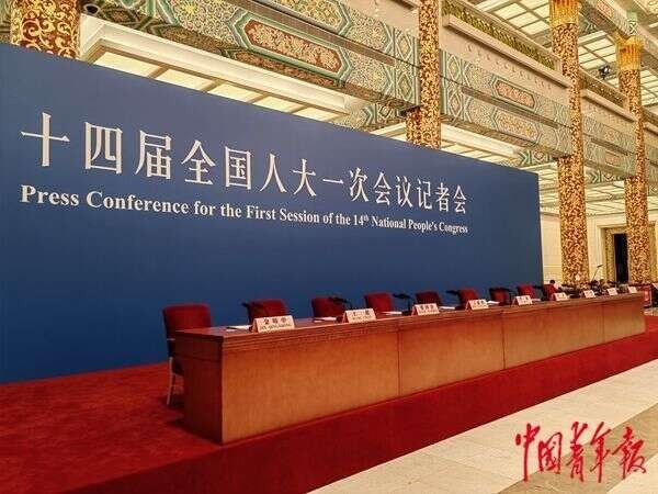記者會(huì)現(xiàn)場(chǎng)沒有擺放鮮花綠植,主席臺(tái)未鋪設(shè)臺(tái)布,藍(lán)色背景板上寫著白色大字:十四屆全國(guó)人大一次會(huì)議記者會(huì)。9把紅色靠背的椅子,正在等待今天記者會(huì)的主角。