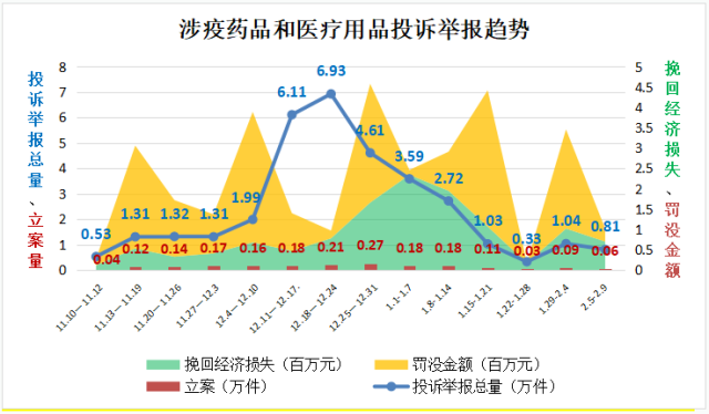 “二十條”和“新十條”出臺后,疫情防控重心從防控感染轉到醫(yī)療救治,2022年11月10日至2022年底,全國12315平臺接收相關投訴舉報24.11萬件,同比增長3.88倍,環(huán)比增長2.95倍,最高峰值達到19.5倍。其中,投訴14.18萬件,舉報9.93萬件,挽回經(jīng)濟損失498.17萬元。