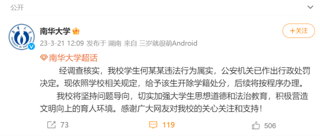 央視網(wǎng)消息:據(jù)@南華大學 微博最新消息,經(jīng)調(diào)查核實,該校學生何某某違法行為屬實,公安機關(guān)已作出行政處罰決定?,F(xiàn)依照學校相關(guān)規(guī)定,給予該生開除學籍處分,后續(xù)將按程序辦理。
