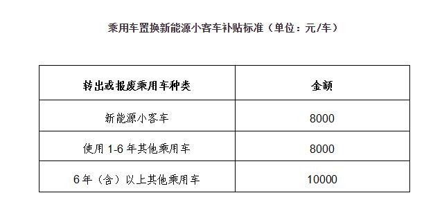 方案指出,報廢或轉出新能源小客車的,每車給予8000元補貼;報廢或轉出使用1-6年其他類型乘用車(非新能源)的,每車給予8000元補貼;報廢或轉出使用6年(含)以上其他乘用車的,每車給予10000元補貼。