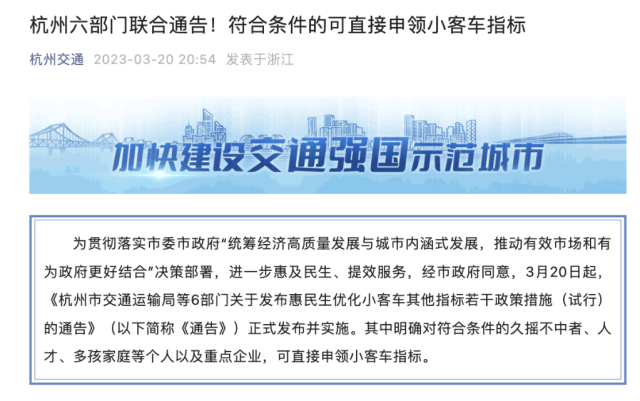 20日晚,杭州市交通運輸局等6部門發(fā)布通告明確,即日起,符合條件的“久搖不中”者、多孩家庭等個人以及重點企業(yè),可直接申領小客車指標。