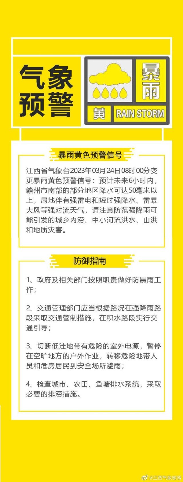 江西省氣象臺2023年03月24日08時(shí)00分變更暴雨黃色預(yù)警信號:預(yù)計(jì)未來6小時(shí)內(nèi),贛州市南部的部分地區(qū)降水可達(dá)50毫米以上,局地伴有強(qiáng)雷電和短時(shí)強(qiáng)降水、雷暴大風(fēng)等強(qiáng)對流天氣,請注意防范強(qiáng)降雨可能引發(fā)的城鄉(xiāng)內(nèi)澇、中小河流洪水、山洪和地質(zhì)災(zāi)害。