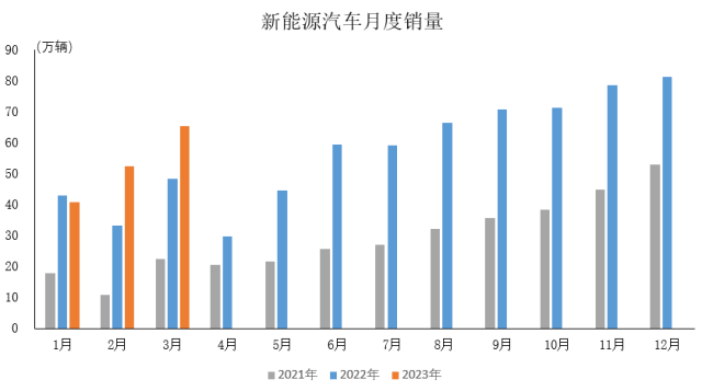 2023年3月,新能源汽車產(chǎn)銷分別完成67.4萬輛和65.3萬輛,環(huán)比分別增長22%和24.4%,同比分別增長44.8%和34.8%。