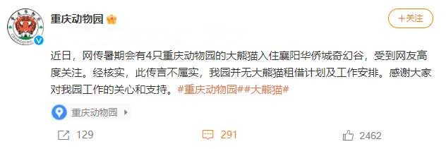 經(jīng)核實,此傳言不屬實,重慶動物園并無大熊貓租借計劃及工作安排。