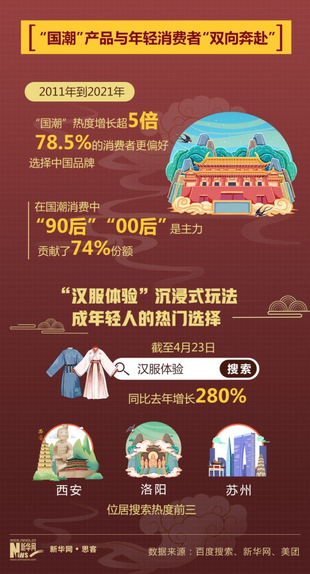 百度搜索大數(shù)據(jù)顯示,從2011年到2021年這十年,“國潮”搜索熱度漲幅528%;2022年底到2023年初,抖音關(guān)鍵詞搜索指數(shù)顯示,國潮在抖音上搜索量呈爆發(fā)增長。新華網(wǎng)以“得物App”為研究樣本發(fā)布的《國潮品牌年輕消費(fèi)洞察報告》顯示,在這些追捧國潮的年輕消費(fèi)者中,“90后”“00后”是主力,貢獻(xiàn)了74%份額。