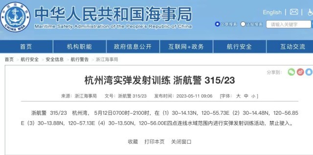 據(jù)中國海事局網(wǎng)站消息,浙江海事局發(fā)布航行警告,5月12日7時至21時,杭州灣部分水域進行實彈發(fā)射訓(xùn)練活動,禁止駛?cè)搿?/p>